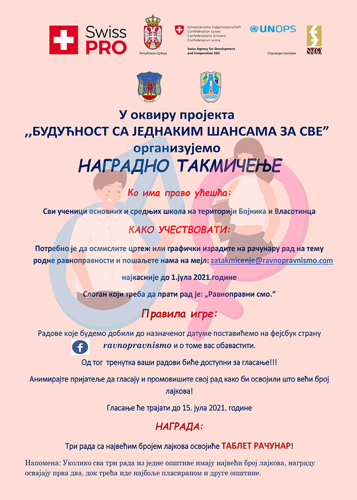 Позивамо све младе да нам пошаљу свој рад на тему родне равноправности. Прикажите нам у виду плаката како доживљавате родну равноправност, шта то за вас представља, шта је то што би требало урадити, за шта се ви залажете, шта је то што вам у друштву смета, шта би променили. Све ово можете представити у виду поруке или сликовитог приказа.