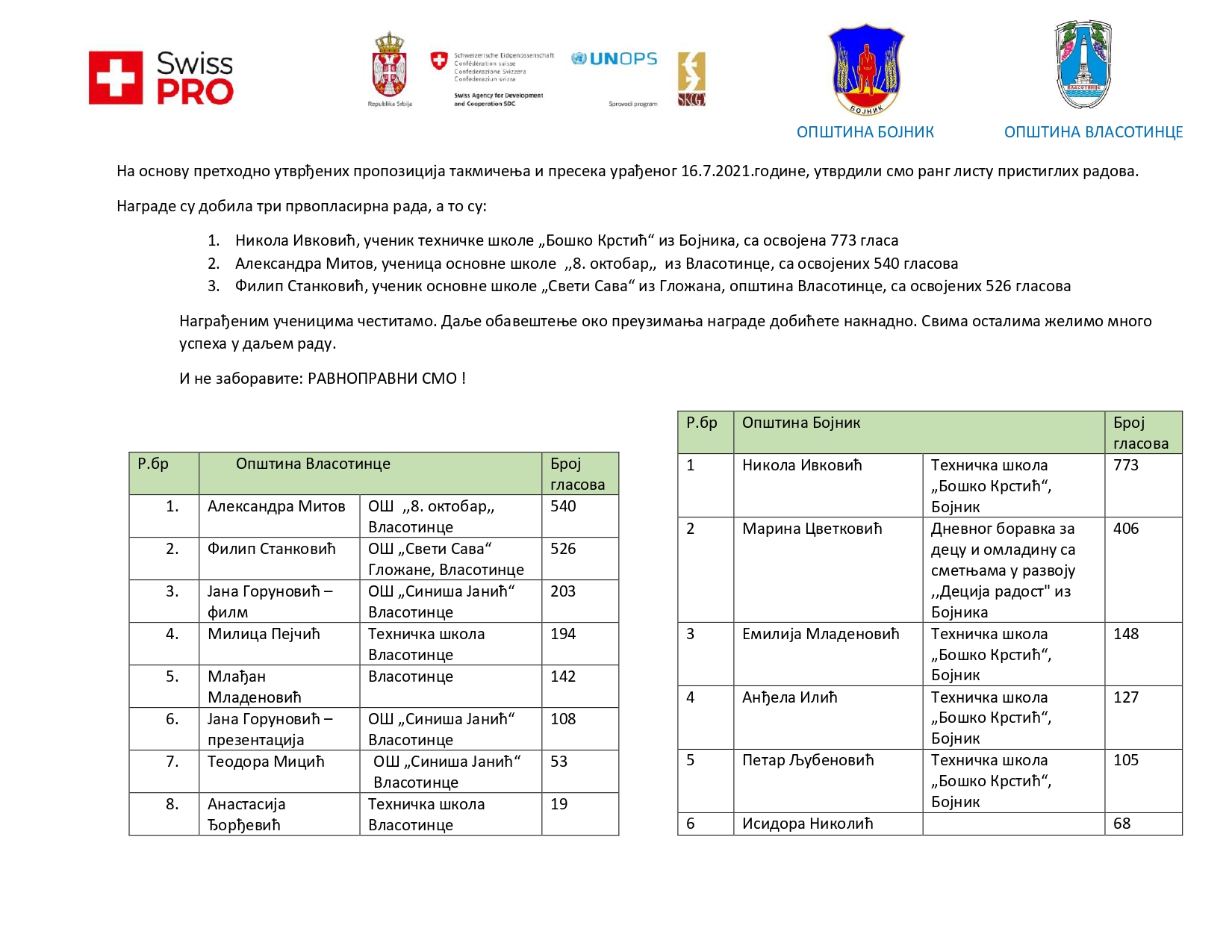(По један рад из сваке од општина и трећи са другим по реду највећим бројем освојених гласова)